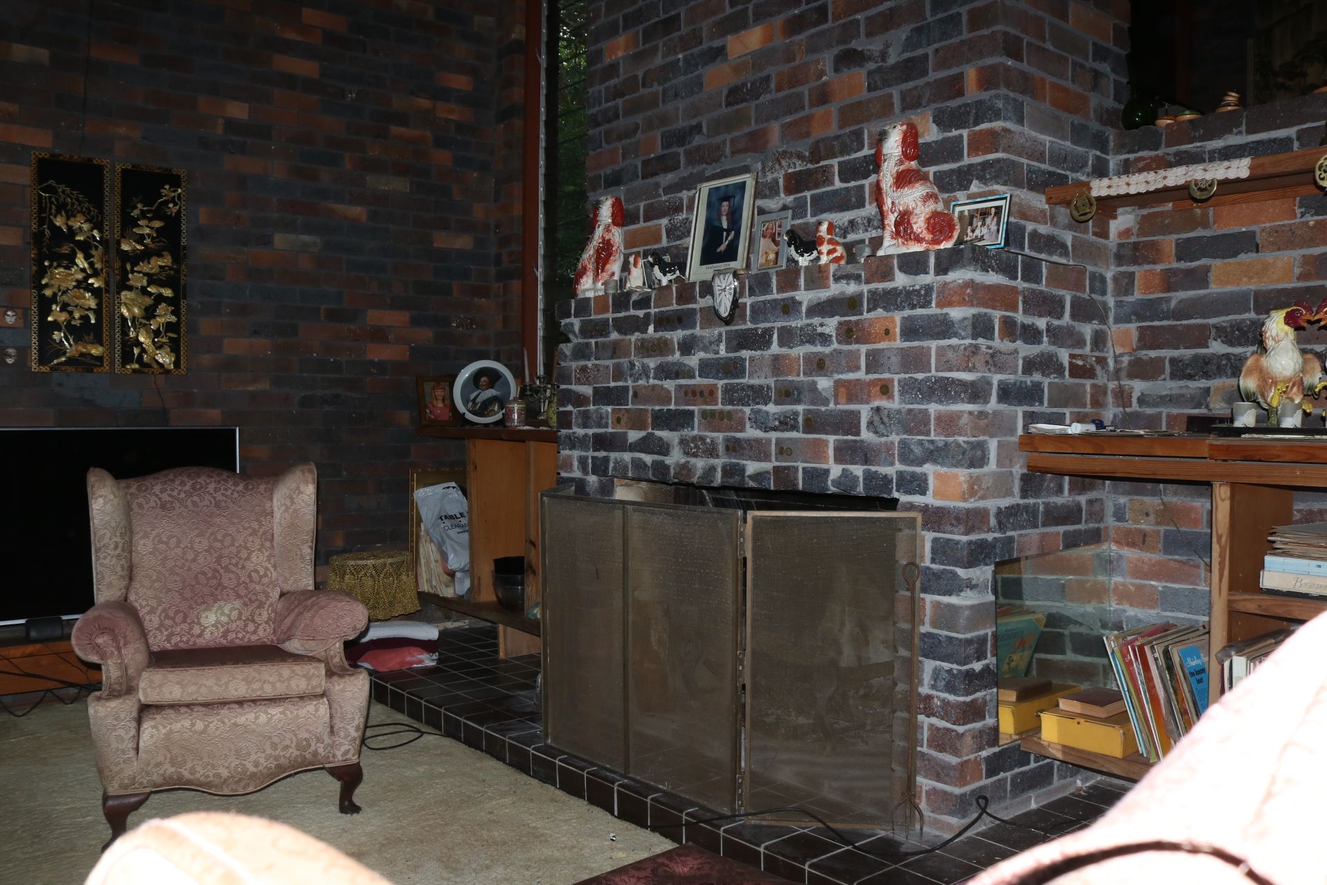 Open fireplace with original grate and tools.
