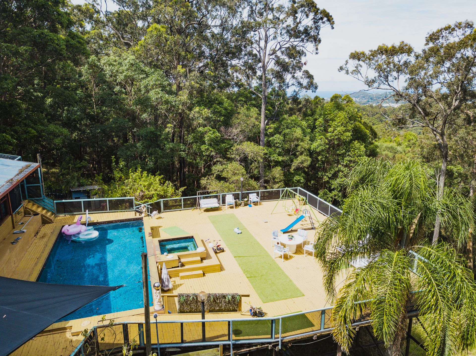Trilevel house built half way down forested allotment is built curved to take in ocean and forest views.