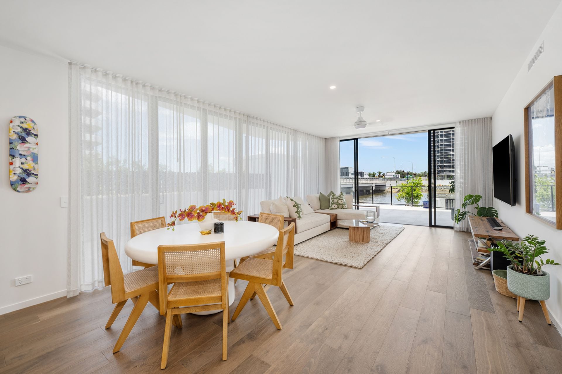 Enjoy 5 Star luxury living in this highly prized waterfront apartment, boasting a massive 201m2 of living. High ceilings and a wide open-plan lounge and dining area, adorned with timber floors and luxury sheers, seamlessly blends indoor and outdoor living on a grand scale.