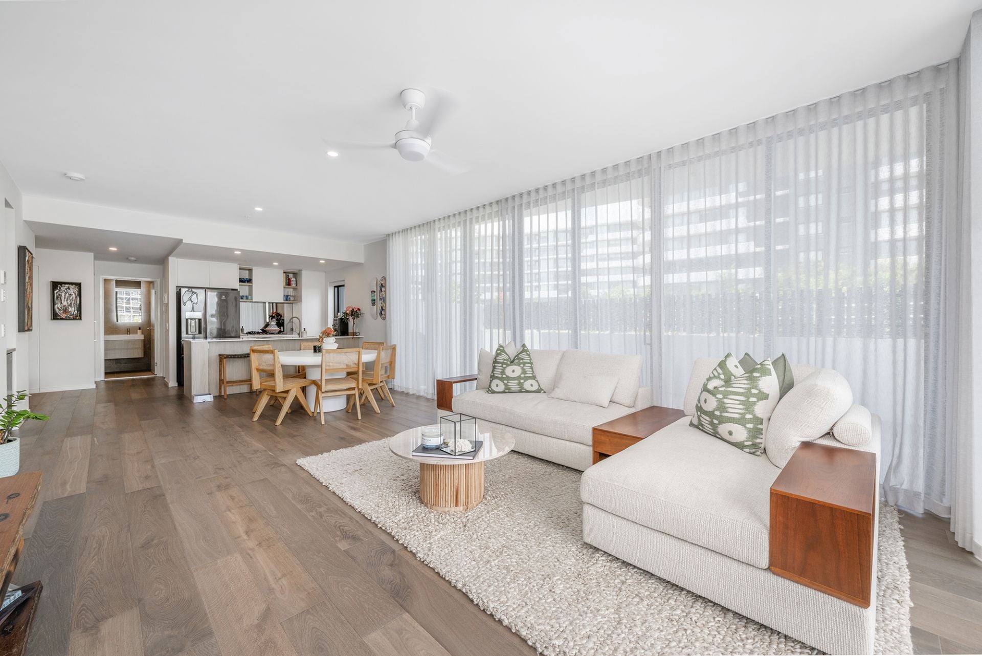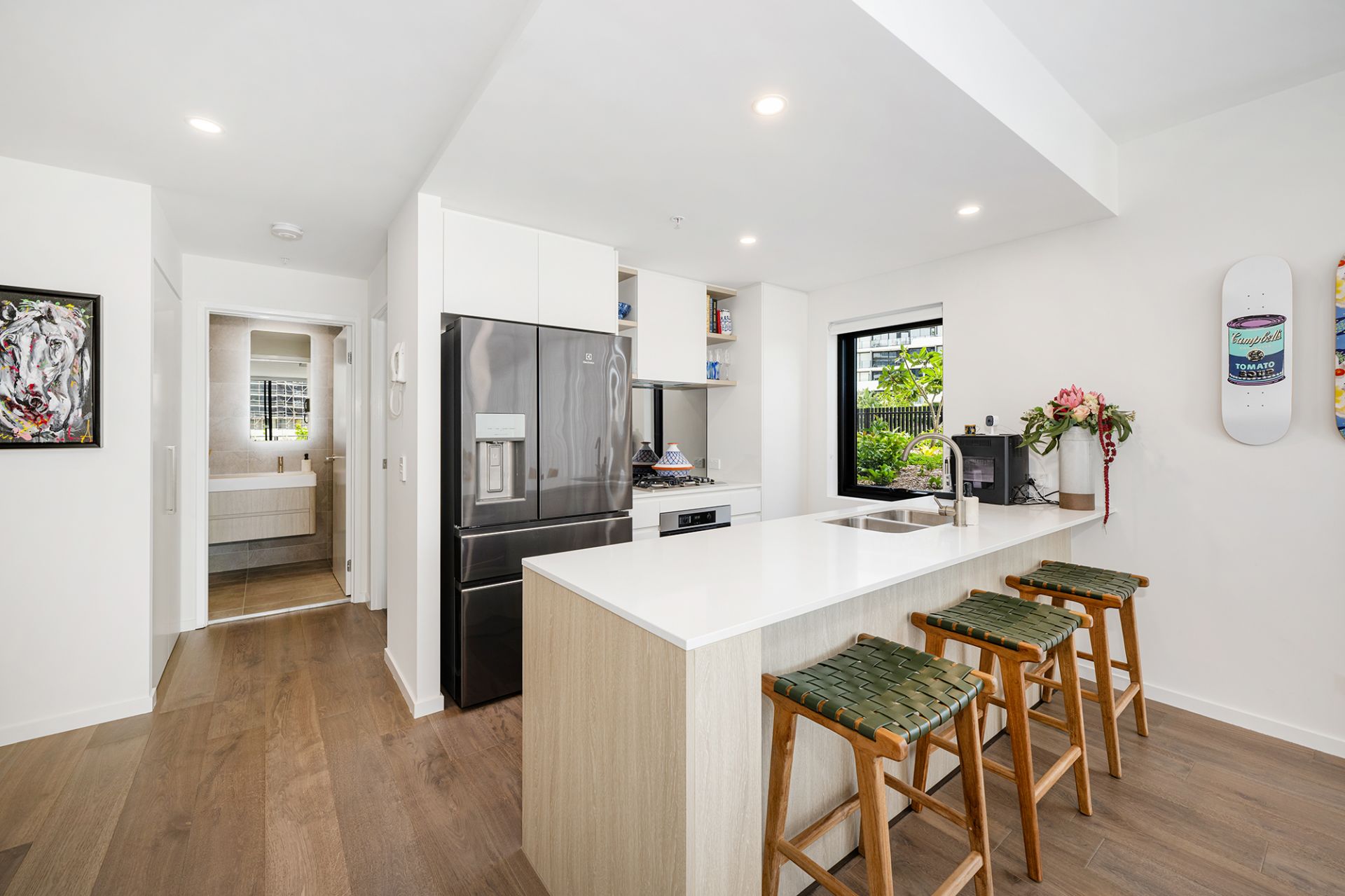 Entertain with ease in the spacious kitchen that connects seamlessly to all living areas. Floor-to-ceiling glass windows flood the space with natural light, enhancing the sense of spaciousness.