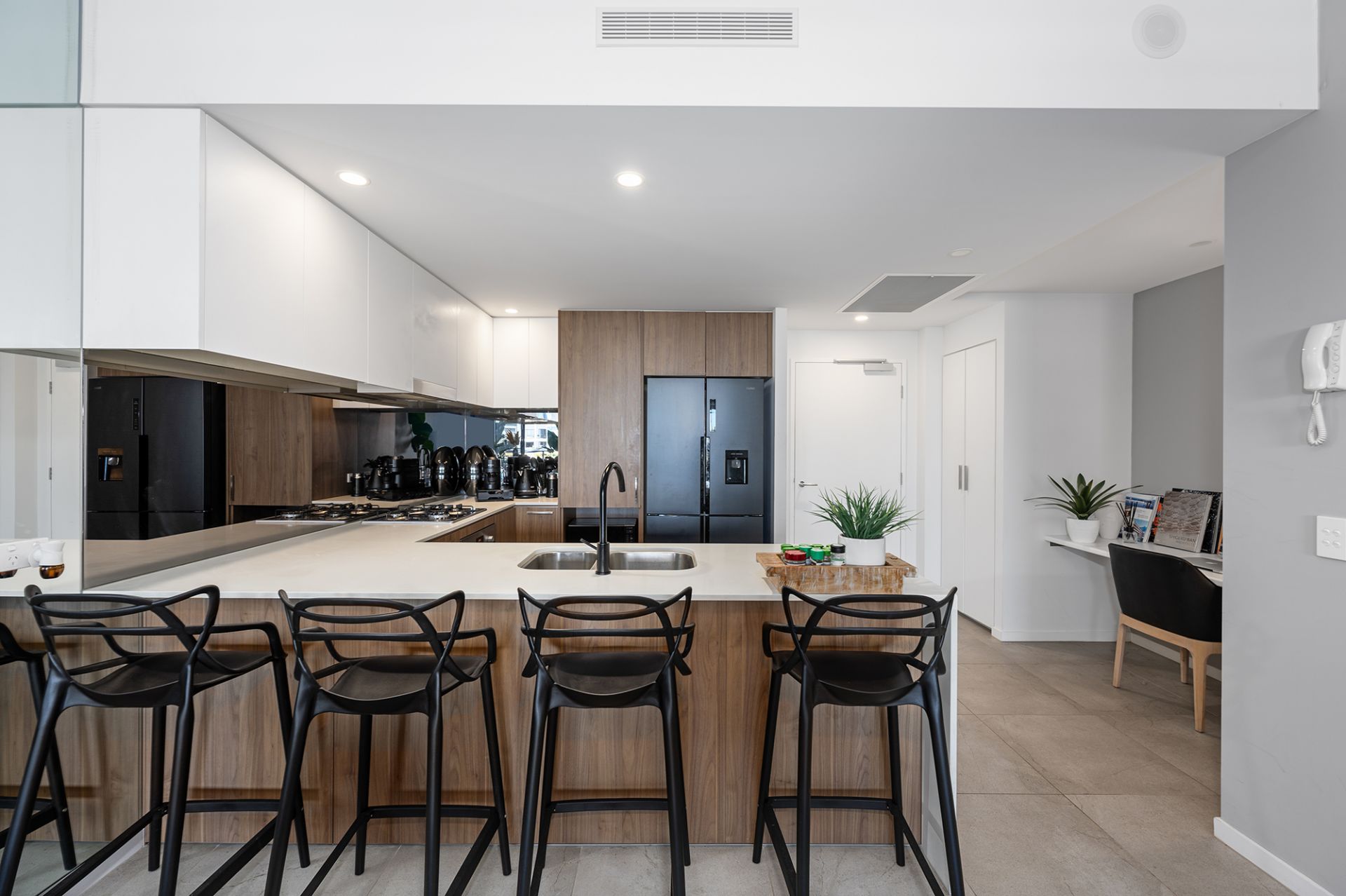 Inside, the apartment has 2 bedrooms, 2 modern bathrooms, an impressive kitchen with stone benches and quality Bosch appliances, 2 car secure spaces, an alfresco balcony, direct boardwalk access and ducted air conditioning.